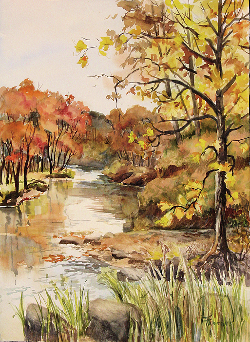 Spider Creek feeds Lake Beaver in NW Arkansas. This shallow creek bed is lovely in the fall with glowing colors reflected in the water. Fishermen float by, children splash in the shallow pools and painters attempt once again to capture the beauty before them. I could paint there 100 times and not do all I would like.